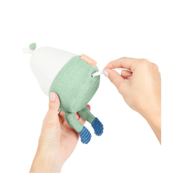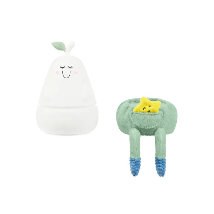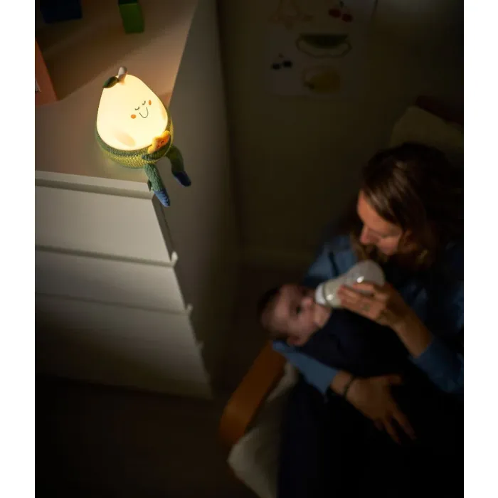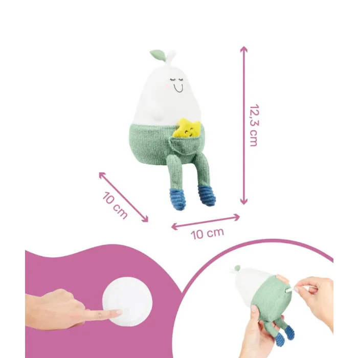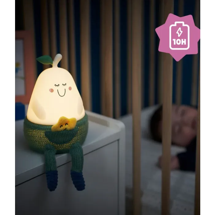 Meet Bertille: the silicone pear-shape nightlight!!. With one single value to control the different modes, Bertille night light is completely user-friendly for your child. Its soft colours and variety of materials will stimulate your baby’s senses of touch and sight. Its legs are easy to grasp, making it perfect for baby’s little hands. As your child grows, they can put it in their cot, enjoy putting the little trousers on or chat with the little star. It reassures baby with its 3 soft lighting modes (white light, 6 colours on a loop or solid colour). But this night light was also designed for you, as parents!. Bertille has a battery life of 10 hours, meaning there’s no need to get up in the night to help baby find their dummy. It is fitted with a rechargeable battery so that baby can sleep peacefully wherever you go. Your baby will never want to be without the adorable pear-shaped silicone nightlight for drifting off to sleep.