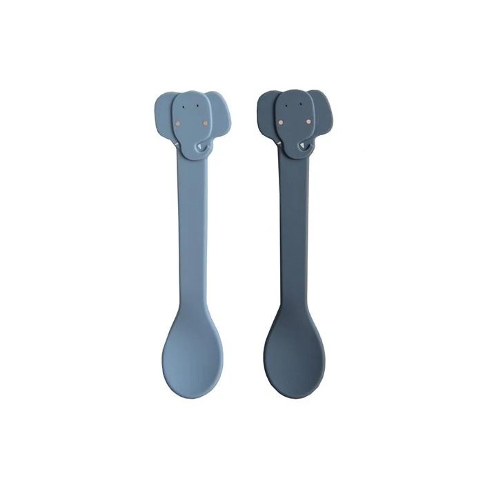 Two colourful spoons with a friendly face to enjoy your meal! These are the ideal spoons to feed your child solid food. The spoons are also great for children who are learning to eat on their own. There is a stainless steel part integrated inside the spoon for sturdiness and to keep it straight. That is why this item is an exception to the rest of the silicone range and cannot be used in the microwave.