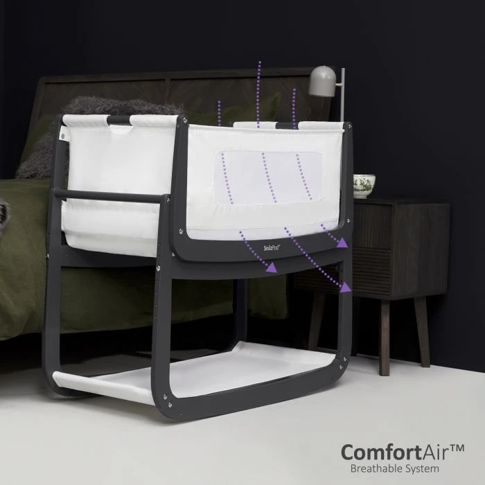 The SnuzPod⁴ Bedside Crib is designed to provide a comfortable and convenient sleeping solution for both parents and babies. With its innovative ComfortAir system, featuring air-flow vents and a machine washable mesh liner, the crib ensures optimal breathability, helping to regulate your baby’s temperature throughout the night. This is essential for promoting a good night’s sleep for both baby and parents.